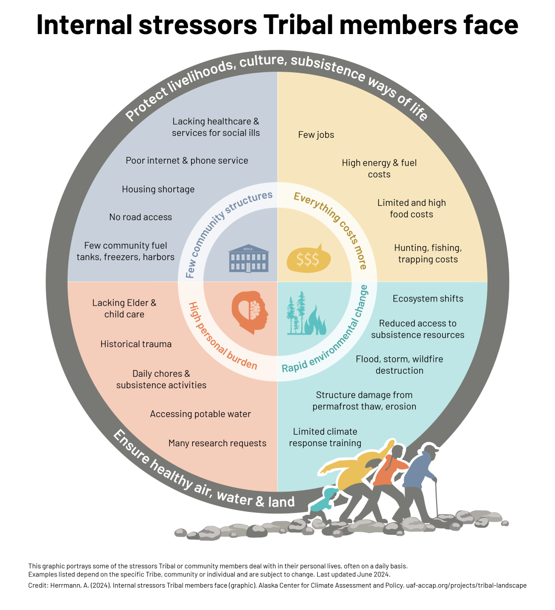 | 2024 | Internal stressors Tribal members face | This graphic portrays some of the stressors Tribal and community members deal with in their personal lives, often on a daily basis. These stressors can be amplified by the fact that many Alaska Tribes and communities are only accessible by aircraft or boat, and some still lack basic services like running water and sewage systems. | 2024 | ||||